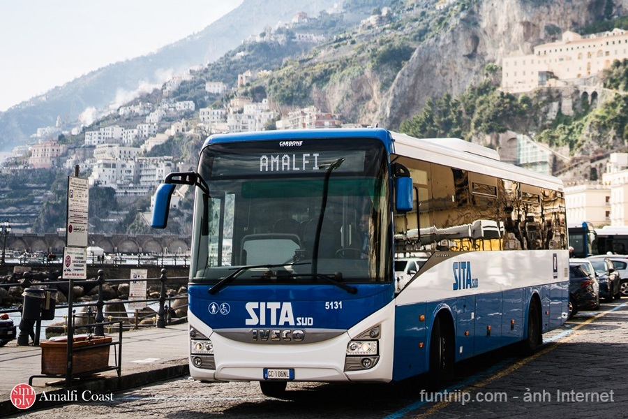 - Bus Salerno → Amalfi (SITA Bus): Thời gian: khoảng 70–90 phút | Giá vé: khoảng €3–5/lượt | Ưu điểm: chi phí rẻ, chạy dọc cung đường ven biển Amalfi Drive (SS163) với nhiều đoạn view đẹp; nhược điểm là đông khách và dễ mệt vào mùa cao điểm.