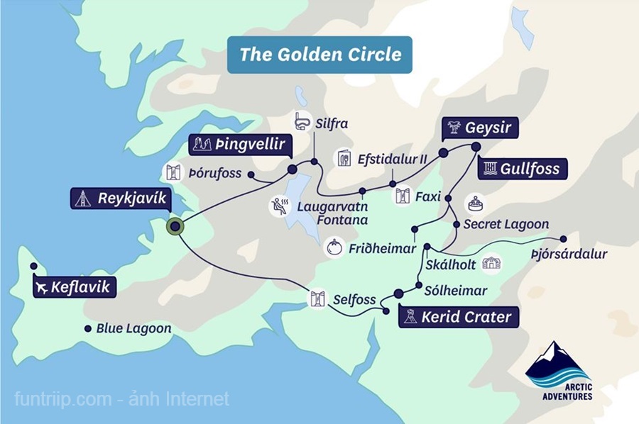 Golden Circle là tuyến vòng cung dài khoảng 230–300 km (tùy lộ trình mở rộng), kết nối ba điểm chính gồm Thingvellir National Park, Geysir và Gullfoss. Hầu hết du khách xuất phát từ Reykjavík và hoàn thành hành trình trong 1 ngày. Golden Circle không phù hợp để đi bằng phương tiện công cộng. Không có tuyến bus địa phương nào kết nối thuận tiện cả ba điểm trong ngày, và giao thông công cộng không được thiết kế cho tuyến du lịch này. Do vậy theo FunTriip, du lịch tự túc Iceland: tuyến Golden Circle, bạn nên thực hiện bằng tour trong ngày hoặc tự lái xe.