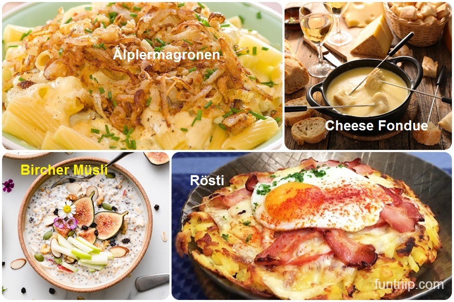 - Rösti (khoai tây chiên kiểu Thụy Sĩ) – Khoai tây bào chiên giòn, thường ăn kèm thịt hoặc trứng. Dễ ăn, có mặt trong hầu hết nhà hàng truyền thống.