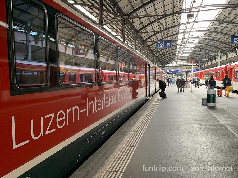 - Tàu IC / IR → Lucerne Bahnhof: Từ ga Zürich Flughafen trong sân bay Zurich, đi tàu IC/IR khoảng 1 giờ – 1 giờ 10 phút đến thẳng Luzern Bahnhof, với tần suất 1–2 chuyến mỗi giờ. Đây là cách di chuyển nhanh, thuận tiện và được đa số du khách tự túc lựa chọn, không cần qua Zurich HB.