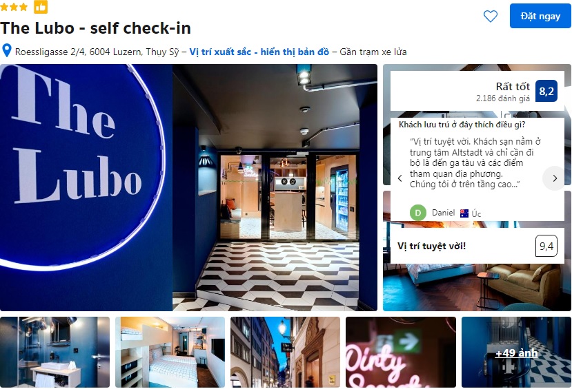 | Khách sạn The Lubo – self check-in ⭐⭐⭐ Khách sạn phong cách hiện đại, nằm ngay khu phố cổ Lucerne, chỉ vài phút đi bộ từ ga Lucerne Bahnhof, Chapel Bridge và hồ Lucerne. Khách sạn áp dụng hình thức tự check-in, tiện lợi và linh hoạt cho du khách tự túc. Vị trí trung tâm rất phù hợp để tham quan, đi bộ khám phá thành phố và bắt tàu hoặc thuyền trong ngày. |