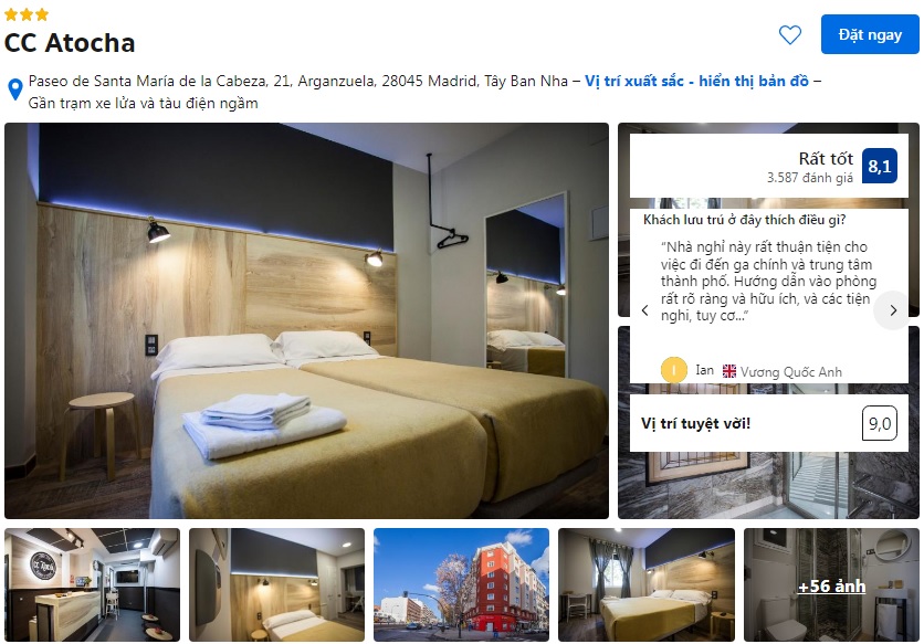 | Khách sạn CC Atocha ⭐⭐⭐ Khách sạn 3 sao nằm gần ga Madrid Atocha, phù hợp cho du lịch tự túc và lịch trình di chuyển bằng tàu hỏa. Khách sạn có phòng ốc gọn gàng, hiện đại, đầy đủ tiện nghi cơ bản, đáp ứng tốt nhu cầu nghỉ ngơi ngắn ngày. Khu vực xung quanh yên tĩnh, dễ bắt metro và bus để vào trung tâm, đồng thời có nhiều quán ăn địa phương và siêu thị nhỏ, tiện cho sinh hoạt hàng ngày. |