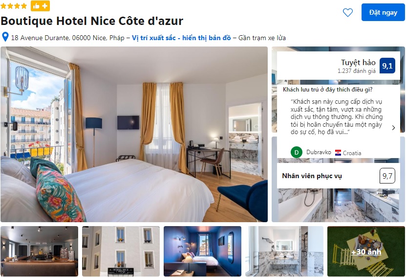 | Boutique Hotel Nice Côte d’Azur ⭐⭐⭐⭐ Khách sạn boutique quy mô nhỏ nằm ở trung tâm thành phố, gần ga Nice-Ville và thuận tiện di chuyển đến các điểm tham quan chính. Khách sạn thiết kế hiện đại, gọn gàng, đầy đủ tiện nghi cơ bản; có khu lounge, sân hiên và phục vụ bữa sáng kiểu Âu. |