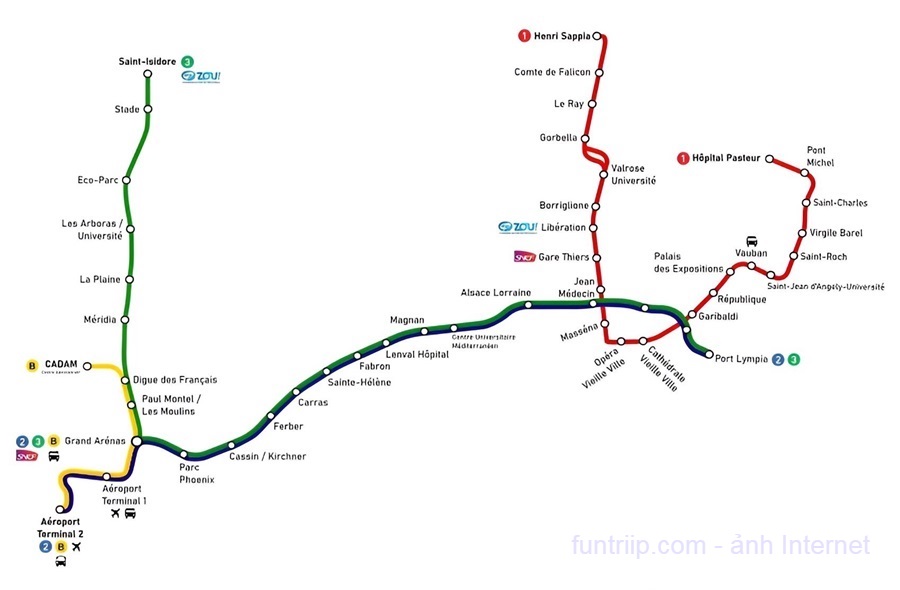 Lưu ý Ga tàu Nice-Ville không có Tram chạy qua, nhưng rất gần các trạm Jean Médecin / Gare Thiers