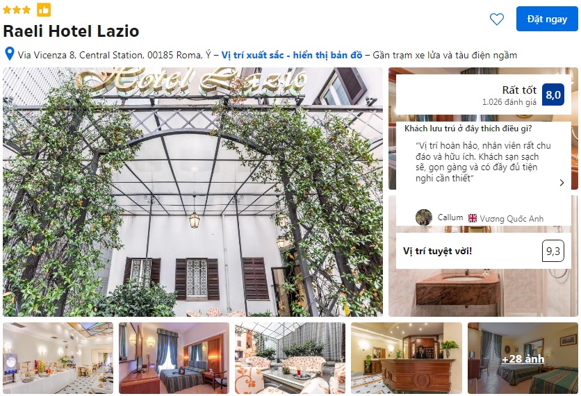 | Khách sạn Raeli Hotel Lazio ⭐⭐⭐ Khách sạn 3 sao tọa lạc gần ga Roma Termini, rất thuận lợi nếu bạn di chuyển nhiều bằng metro, bus hoặc tàu liên tỉnh. Từ đây có thể dễ dàng tiếp cận Colosseum, Vatican và các khu tham quan nổi tiếng. Khu phố xung quanh khá sôi động với nhiều quán ăn nhanh, café và cửa hàng tiện lợi, phù hợp cho lịch trình gọn gàng và ngân sách vừa phải. |