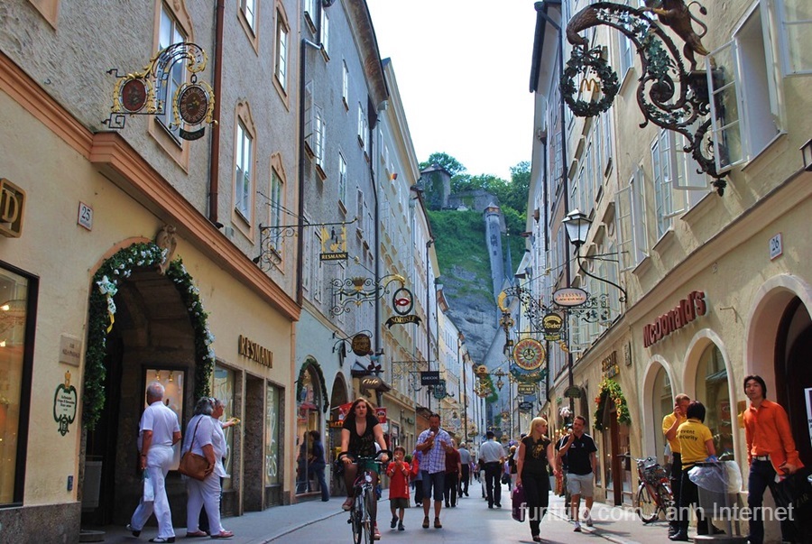 – Góc chụp đẹp: phố Getreidegasse, quảng trường Residenzplatz, lối đi ven sông Salzach.