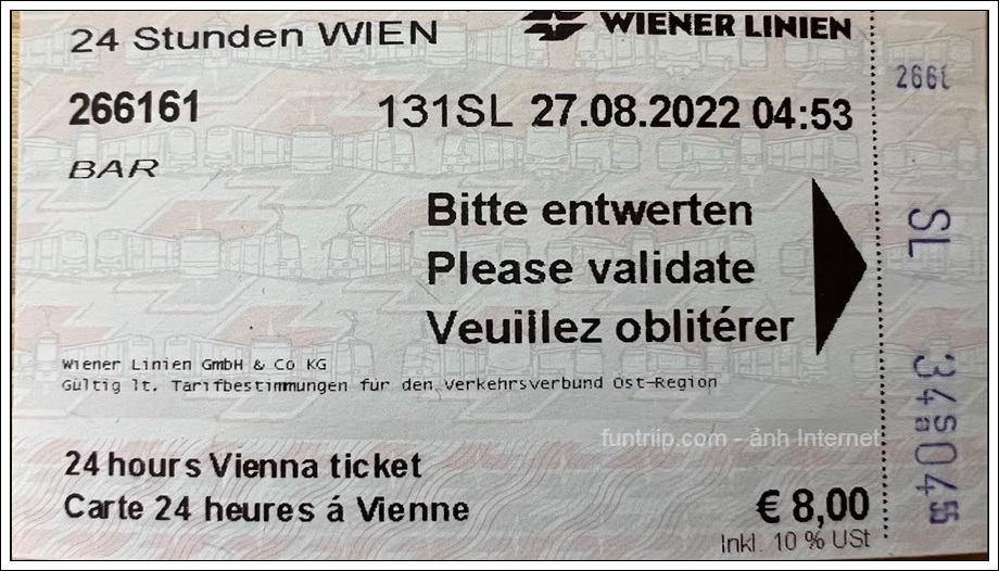 - Vé giấy (Paper ticket): Có thể mua tại máy bán vé tự động trong các ga U-Bahn, tại các trạm lớn hoặc cửa hàng Tabaktrafik (quầy bán thuốc lá). Vé giấy áp dụng cho các loại như 1 Trip VIENNA, 24 Hours VIENNA và 7 Days VIENNA. Khi sử dụng, bạn cần chạm (validate) vé tại máy trước khi lên phương tiện.