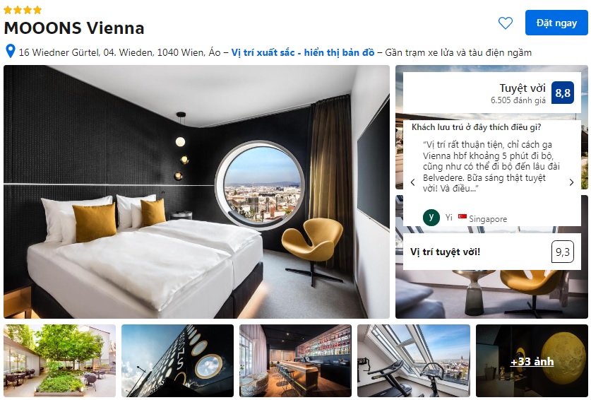 | MOOONS Vienna ⭐⭐⭐⭐ Khách sạn nằm gần ga trung tâm nên di chuyển rất thuận tiện bằng tàu, metro và tram; phòng thiết kế hiện đại, cách âm tốt, có rooftop bar và khu vườn thư giãn; nổi bật với concept “mặt trăng” khác biệt so với các khách sạn quanh khu vực. |