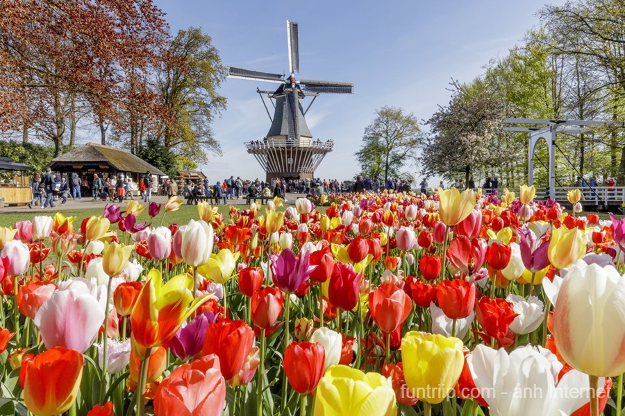 – Góc chụp đẹp: các luống tulip chạy dài, khu hồ nước và cối xay gió – biểu tượng quen thuộc của Keukenhof.