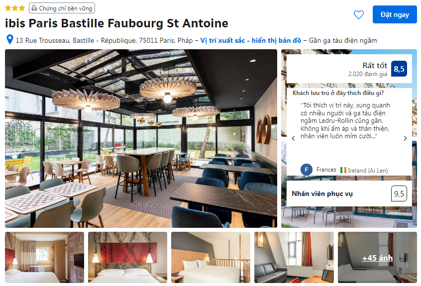 | ibis Paris Bastille Faubourg-Saint-Antoine ⭐⭐⭐ Khách sạn chuỗi uy tín, phòng nhỏ nhưng hiện đại, nằm gần Bastille và Le Marais. Giá mềm so với vị trí trung tâm mở rộng. Dễ đi bộ hoặc bắt metro đi mọi điểm tham quan. |