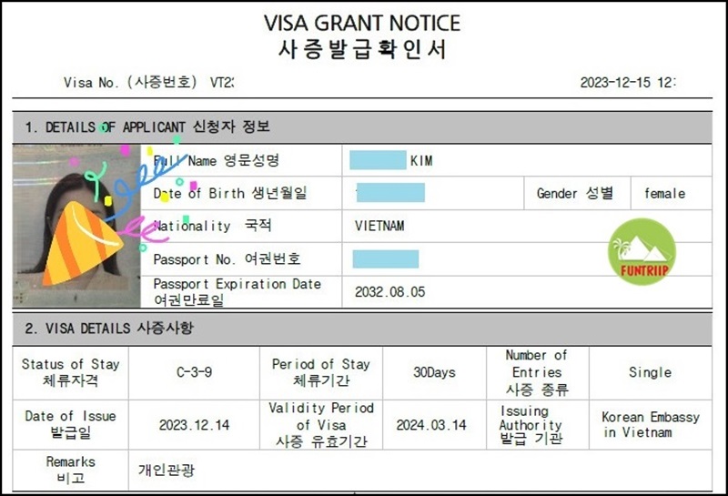 Visa du lịch Hàn Quốc C-3-9 nhập cảnh 1 lần, thời gian lưu trú 30 ngày, có giá trị sử dụng trong 3 tháng. Thời gian xét Visa khoảng 16 ngày làm việc, quý khách nên xin visa trước khoảng 2 tháng.